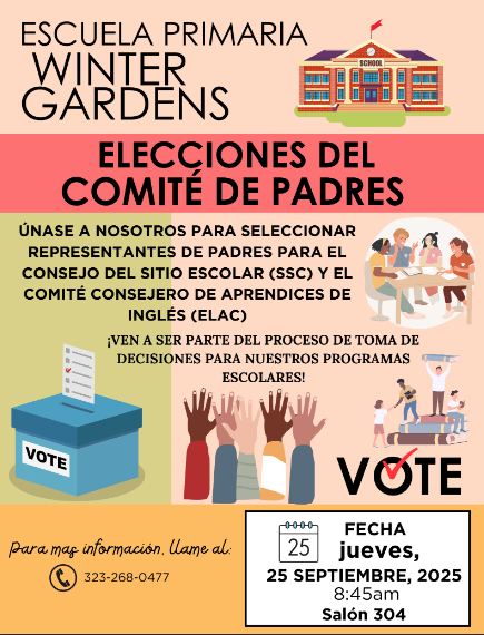 Parent Committee Elections for SSC & ELAC Thursday, September 25, 2025 at 8:45 a.m Attached Files WGE-COMMITTEE FLYER (1).pdf